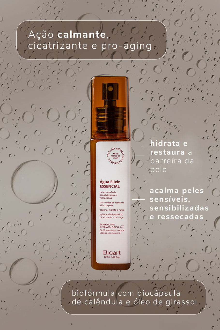 A Água Elixir é o cuidado que completa sua rotina. Desenvolvida para peles sensíveis, ressecadas ou sensibilizadas, oferece alívio imediato, hidratação profunda e regeneração celular. Sua ação natural acalma, nutre e restaura o equilíbrio cutâneo com leveza e eficácia.